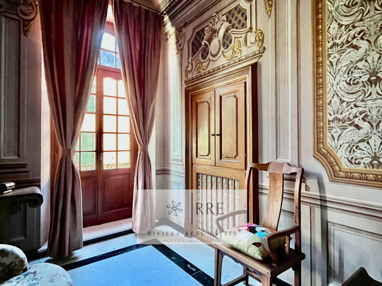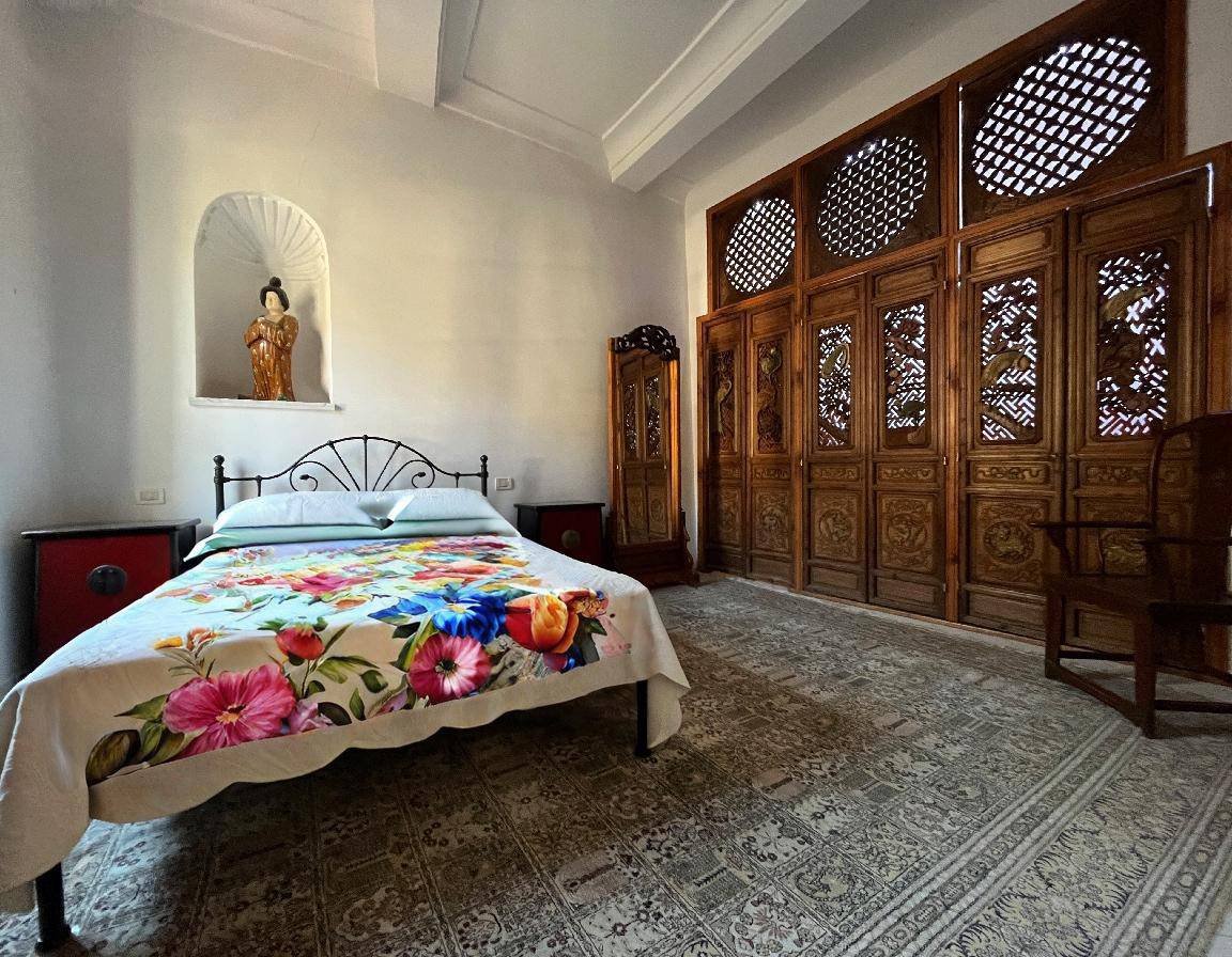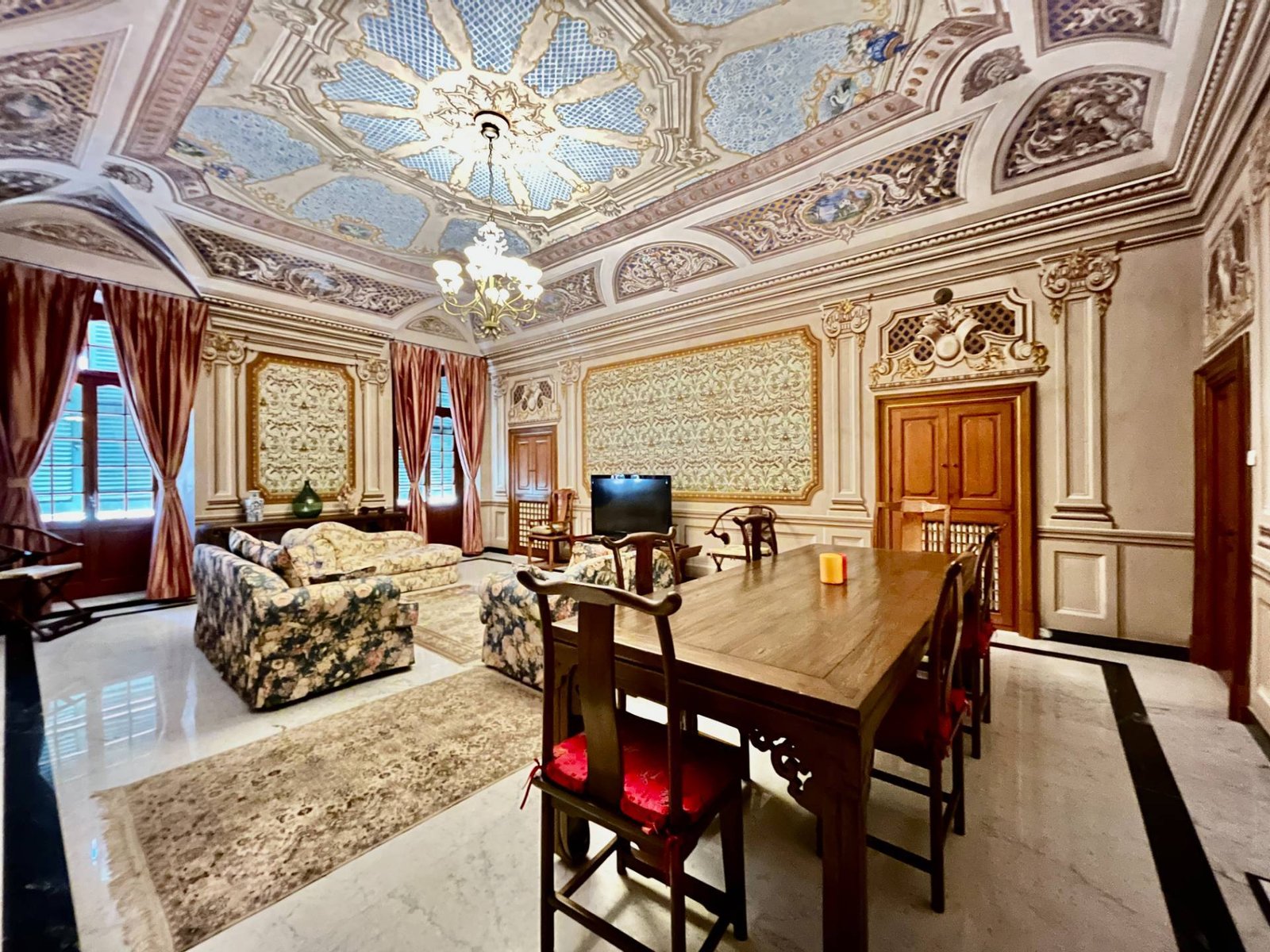 Upon entering, guests are welcomed by a large living room, a true masterpiece, with frescoes covering the ceilings and walls. This reception area, characterised by natural light filtering through large windows, is the ideal place for entertaining in style, creating an atmosphere of timeless elegance.