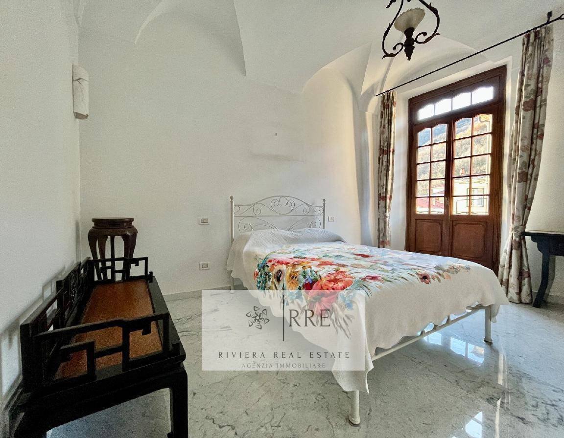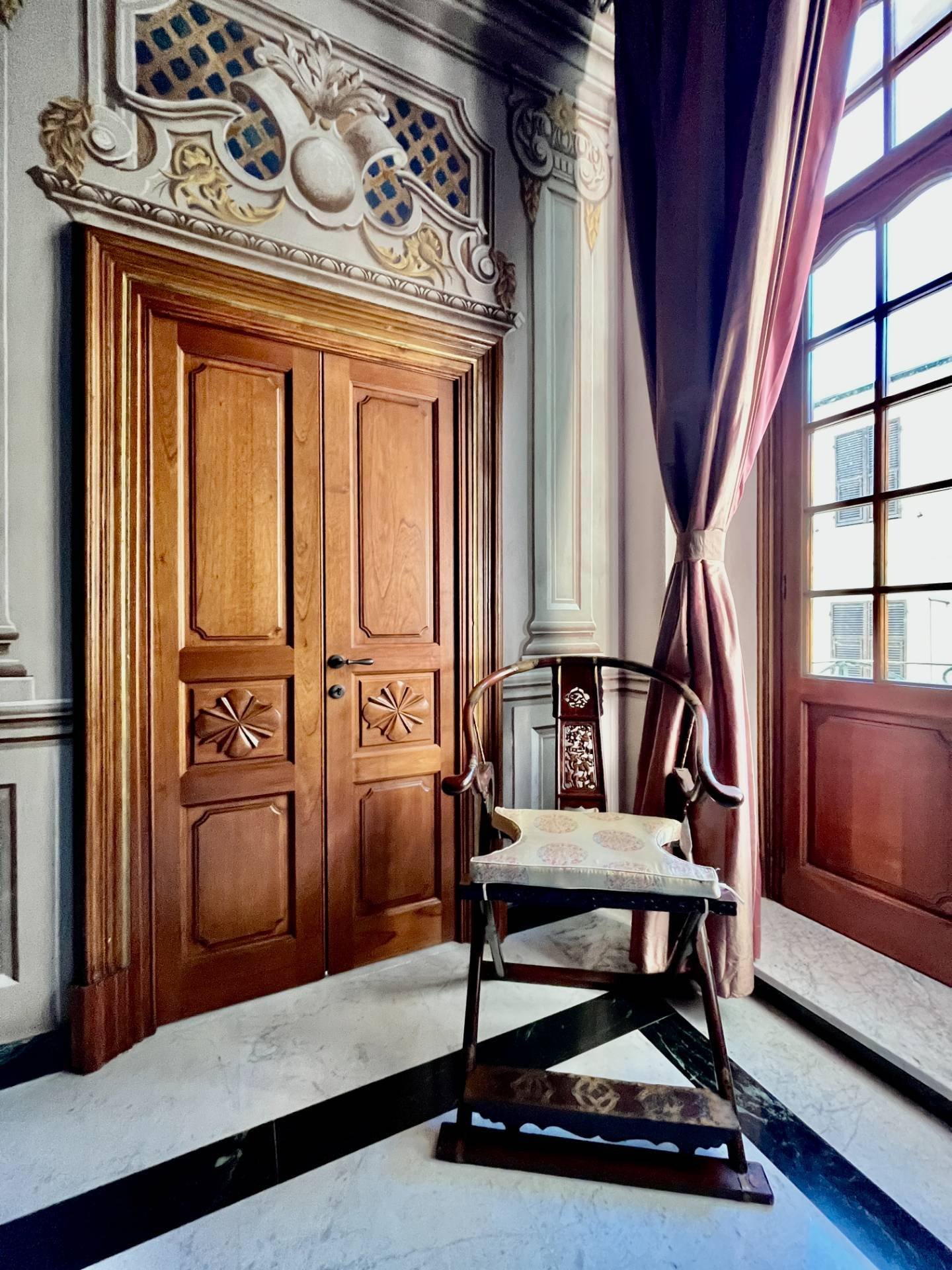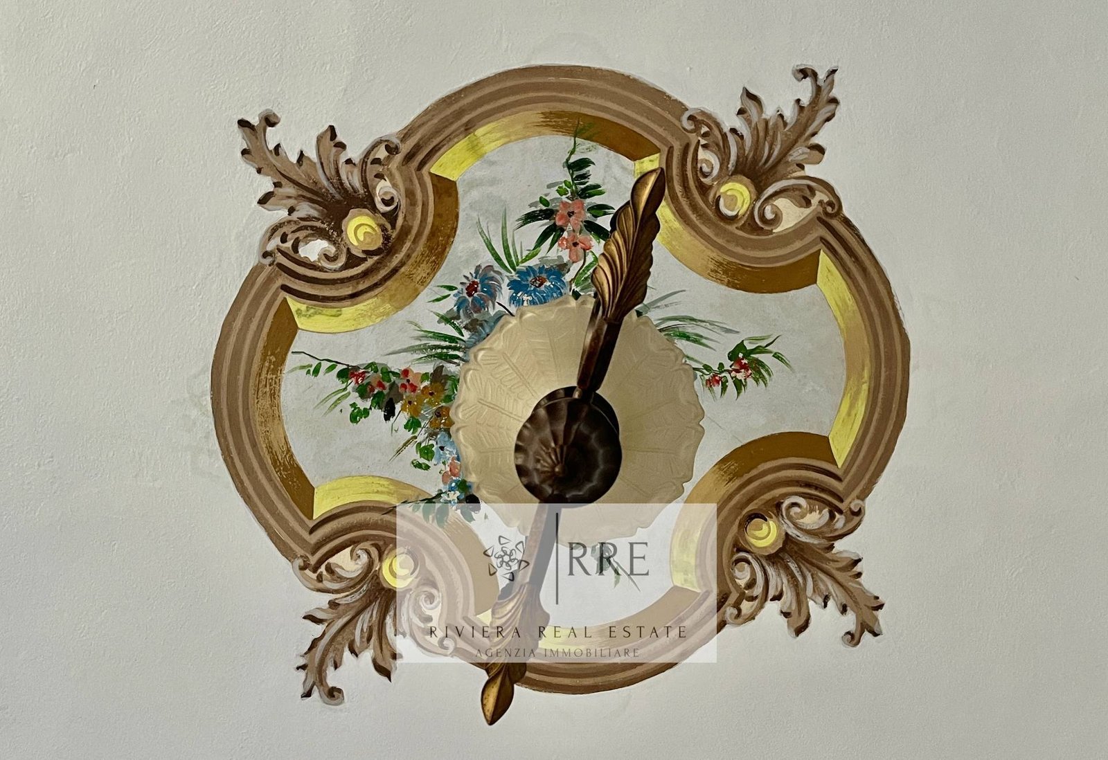 Upon entering, guests are welcomed by a large living room, a true masterpiece, with frescoes covering the ceilings and walls. This reception area, characterised by natural light filtering through large windows, is the ideal place for entertaining in style, creating an atmosphere of timeless elegance.