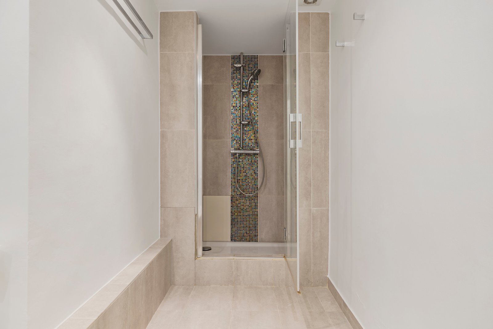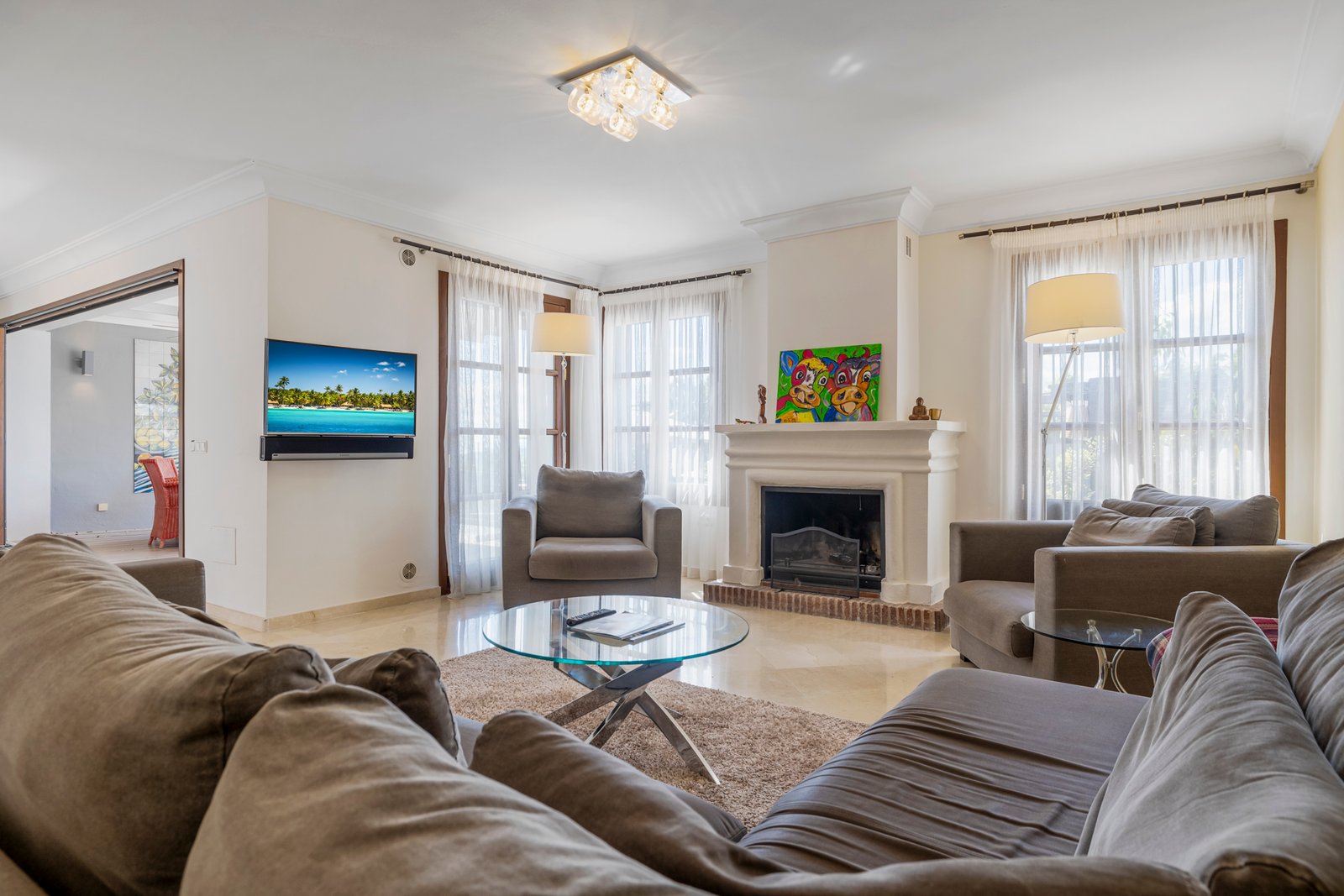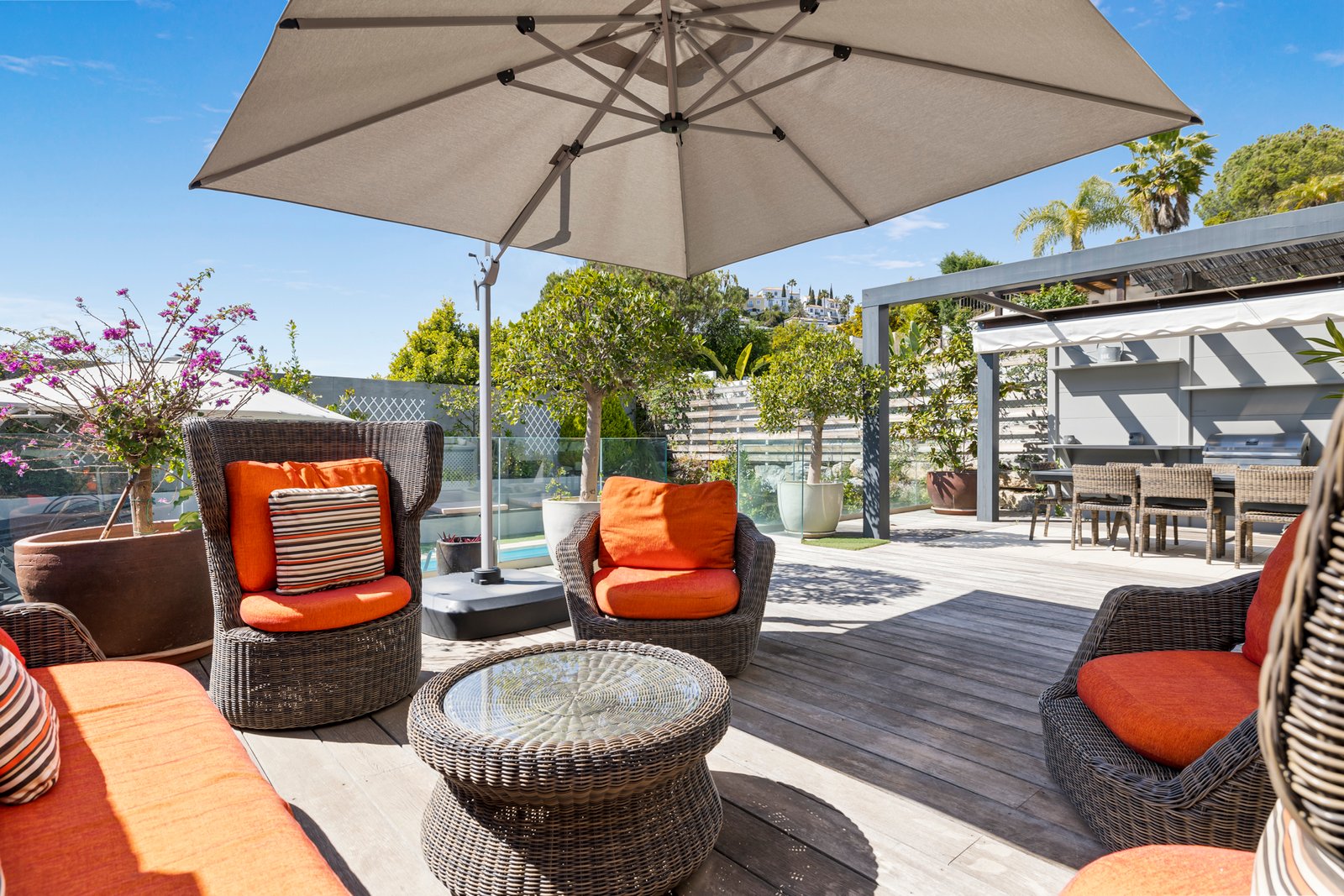 The main floor forms the social heart of the home, with a spacious open-plan living and dining area centred around a cosy fireplace. The modern kitchen is fully fitted with premium Bosch and Liebherr appliances, including gas cooking, designed to meet the needs of both everyday living and entertaining. From here, large doors open out to a covered terrace that flows seamlessly into an outdoor lounge and BBQ area, surrounded by a private garden and pool, an idyllic setting for dining al fresco or enjoying Marbella’s year-round sunshine.