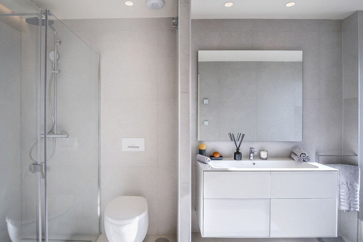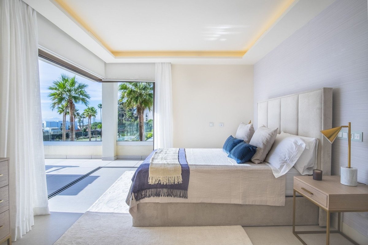 Discover this brand new beachfront villa for sale, located in the prestigious gated community of Velaya on the New Golden Mile in Estepona. This exquisite property offers a south/south-west orientation, providing breathtaking views of the Mediterranean Sea. Enjoy direct access to the beach promenade and sandy shores, making it an ideal retreat for those seeking luxury and tranquility. The villa boasts a sophisticated interior layout with four spacious bedrooms and four bathrooms, complemented by a guest toilet. The open-plan kitchen and living room are designed with expansive sliding windows that blend indoor and outdoor spaces seamlessly. The basement, bathed in natural light, features a chill-out area, games room, bar, and gym, catering to all your leisure needs. Outside, the property is designed for both relaxation and entertainment. It features generous terraces, a private garden, a swimming pool, a jacuzzi, and an outdoor mini-kitchen with a BBQ area. Modern comforts include an elevator, a top-of-the-line aerothermal system, underfloor heating, air conditioning, and electrical blinds and shutters. With three dedicated parking spaces, This Villa is fully furnished and turnkey ready, offering unparalleled luxury and convenience. This Villa is an exclusive frontline beach residential development of only 38 high-end properties and amenities such as an exterior heated pool, pool for children, jacuzzi, large pool deck with sun-beds and Balinese beds, all offering stunning sea views.