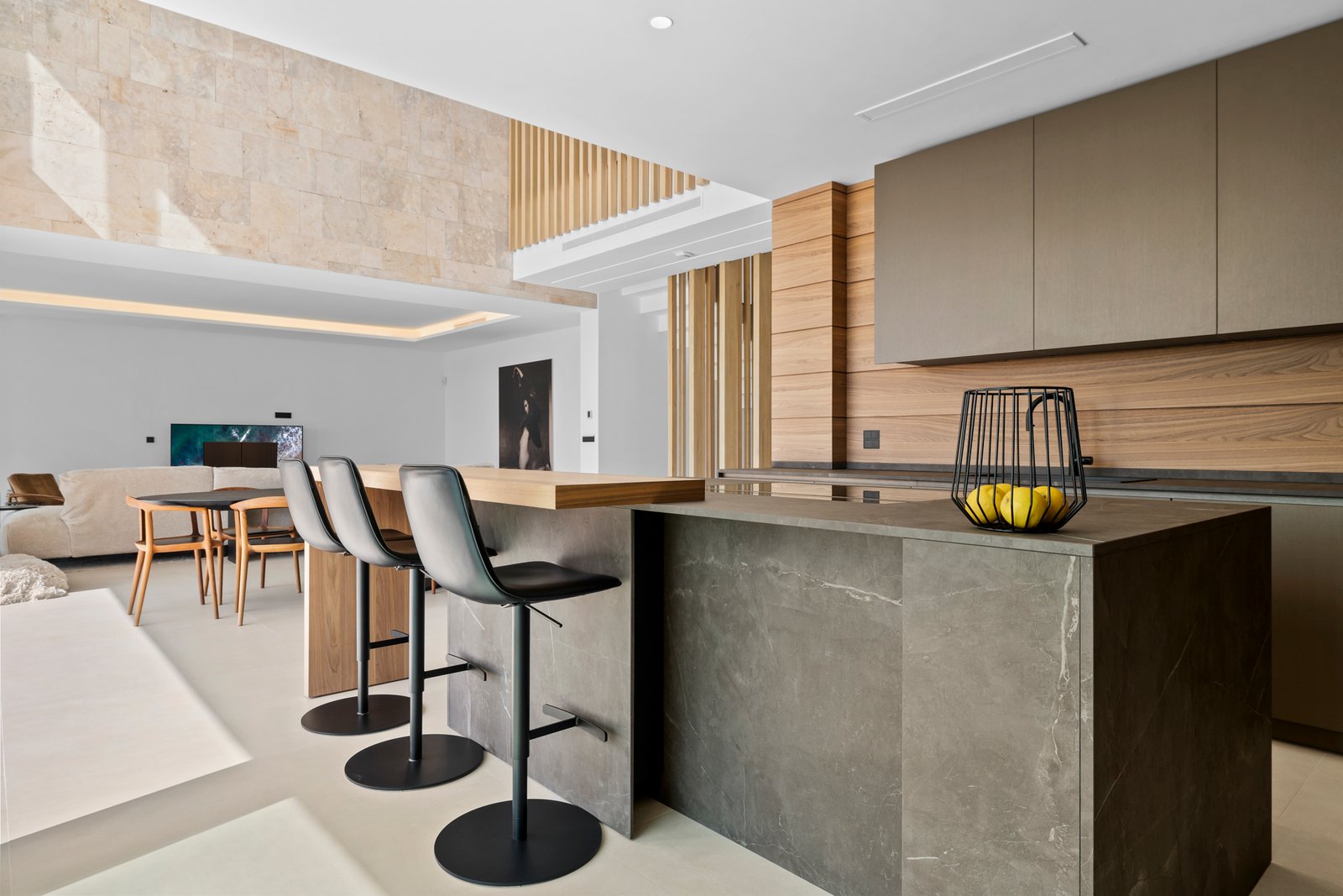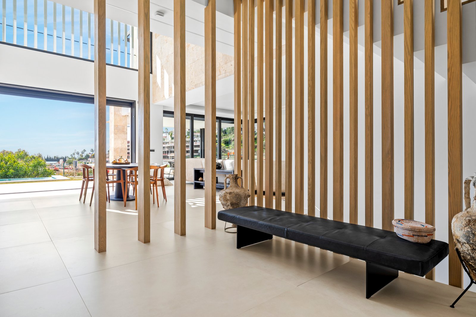 Set on a generous 1,238 m² plot with a 128 m² terrace, the villa boasts expansive open-plan living spaces designed for modern comfort. The bright and airy interiors feature a state-of-the-art Modulnova kitchen, fully equipped with top-of-the-range Miele appliances. The ground floor comprises a spacious living and dining area with soaring ceilings, a high-end kitchen, a guest bedroom with an en-suite bathroom, a guest toilet, and a functional laundry room with built-in wardrobes and direct garden access. Floor-to-ceiling windows seamlessly connect the interior to the extensive sun-drenched terrace, which offers stunning views of the beautifully integrated infinity pool, creating a true holiday atmosphere.