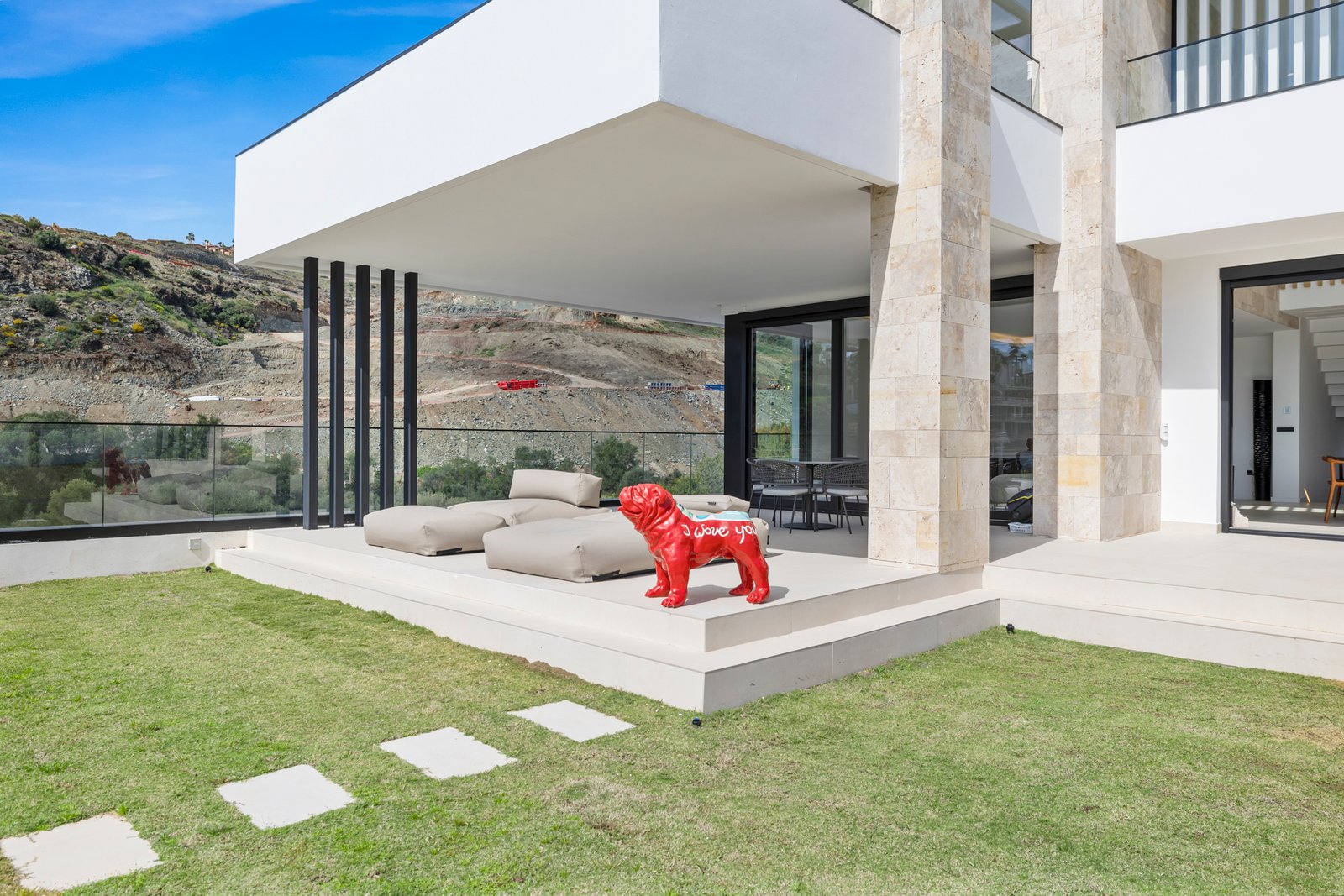 Designed with energy efficiency and security in mind, the villa features dimmable lighting, underfloor heating, individually controlled hot and cold air conditioning via a smart app, smoke detectors, and 20 solar panels, achieving an A-rated energy certification. A1 security cameras and a state-of-the-art alarm system provide enhanced safety and peace of mind. Large windows fill the home with natural light, while south- and west-facing windows are fitted with remote-controlled electric screens for added comfort.