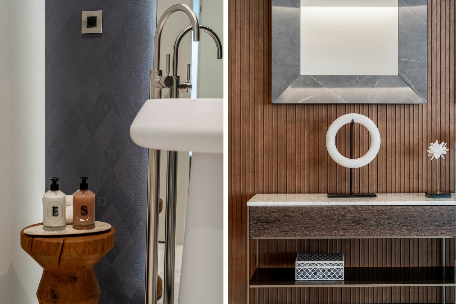 Every corner pays homage to exquisite details, from Fendi-designed wardrobes and kitchen furnishings to custom wooden panels on the walls, Travertine marble bathrooms, and high-end finishes. Interiors by GC Studio blend renowned Italian brands like Gallotti & Radice and Giorgetti with fine materials such as Carrara marble, natural stone, onyx, and genuine leather. Within the exclusive community, this residence redefines refined living in one of Marbella’s most privileged settings.