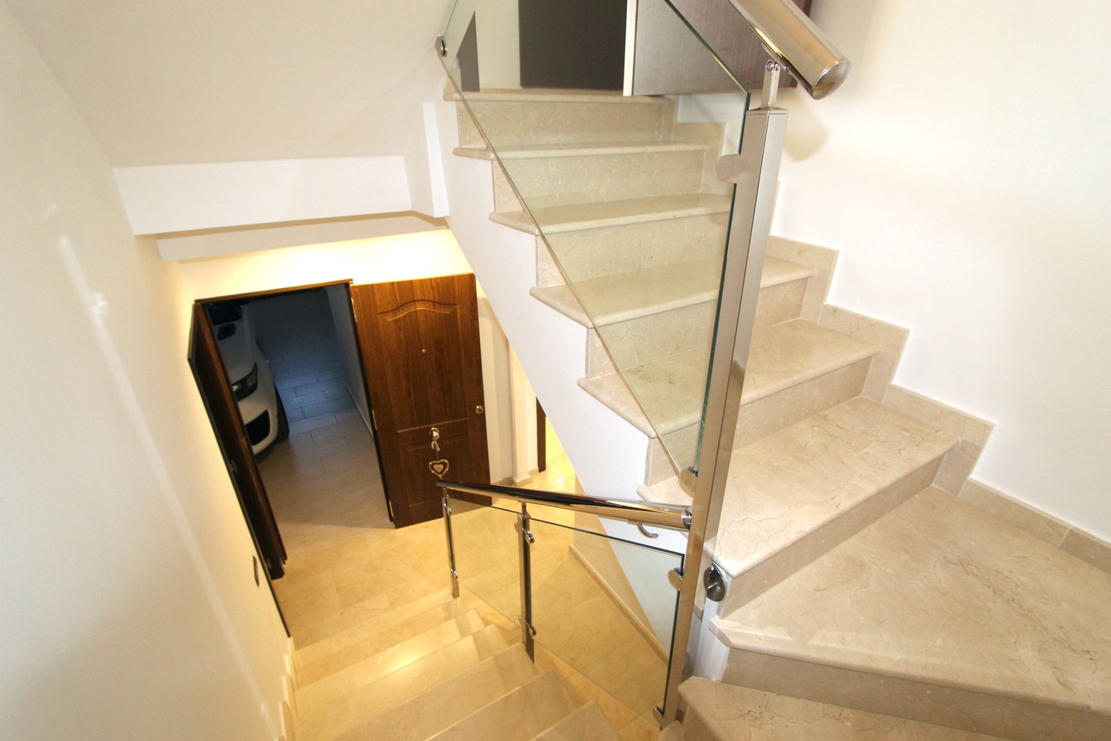 The property is distributed over 2 floors plus basement. On the elevated Ground floor you will find a spacious and bright south facing living and dining room leading out to a great size terrace, a modern kitchen, a guest bathroom and big built in wardrobe in the hallway. On the first floor you will find 2 bedrooms & 2 bathrooms of which one is en-suite. Both bedrooms are facing south and have their own terrace. In the basement you will find a very spacious Guest bedroom with en-suite bathroom and a build in wardrobe, an office, a good size Laundry & utility room plus a spacious Garage. The owner has chosen high quality Italian sand stone for the flooring in the entire house.